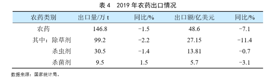 从国家统计局数据来看,我国农药行业规模以上企业主营业务稳步增加,但企业数量逐渐减少,2019年较2009年的956家减少了237家。从企业利润方面来看,利润不断增长,但增幅收窄。受外部环境和产业政策的多重因素影响,企业生产成本增加,产品价格上涨受限,规模以上企业利润总额增幅收窄,2019年利润总额197.80亿元,同比增长0.2%。从企业平均利润表现来看,2019年平均利润为2751.04万元,同比下降6.6%,连续2年同比下降。 1.2 农药产量小幅增加,结束连续两年下跌 国家统计局数据显示,2019年农药行业规模以上企业化学农药原药(100%)产量为225.4万t,同比增加1.4%。 其中,除草剂产量为93.5万t,同比增长0.4%,占农药总产量的41.5%;杀虫剂产量为38.9万t,同比下降2.1%,占农药总产量的17.3%;杀菌剂产量为16.5万t,同比增长0.3%,占农药总产量的7.3%。 从各省市产量情况看,根据国家统计局的统计,2019年农药产量前3的省份依次是:江苏省、四川省和浙江省,农药产量分别为74.3万t、39.2万t和20.8万t,产量均超20万t,占总产量的59.6%;其次分别为山东省、湖北省、安徽省和河南省,产量均在7万t以上。 数据来源:国家统计局。 图1 2019年我国农药生产大省产量情况 江苏省作为农药生产第一大省,受响水事故影响,部分重要农药生产企业被迫停工限产。此事件带来的更加严厉的政策波及到省内其他企业,2019年江苏农药总产量同比减少3.3%。浙江、湖北、安徽、河南、江西和湖南农药产量亦有下降,同比分别减少4.5%、7.3%、2.2%、10.2%、11.3%和42.9%。此外,江浙沪一带的部分生产企业外迁,带动一些省市农药生产能力和产量增加。与此同时,其原有本土企业通过增加环保投入和减少停产检修等措施提升开工率,使得产量增长显著,如四川、河北、内蒙、广西和吉林,同比增加分别为24.8%、31.7%、29.8%、35.9%和33.5%。 1.3 农药出口回落,贸易顺差出现首降 2019年,由于贸易战持续扩大、全球经济不振、外部环境恶化,我国农药进出口贸易顺差自2016年以来首次出现下降。国家统计局数据显示,2019年,我国农药进出口贸易总额56.2亿美元,同比下降5.0%,贸易顺差41.0亿美元,同比下降9.8%。各类别农药进出口总额和贸易顺差值均出现不同程度的下降。 1.3.1 农药出口量价双降 受贸易战和汇率变动等因素影响,2019年我国农药出口量小幅下降,出口金额降幅明显。国家统计局数据显示,2019年我国农药出口量146.8万t,同比下降1.5%,出口金额48.60亿美元,同比下降7.1%。 从农药类别出口情况来看,除草剂出口量99.2万t,同比下降2.2%,出口金额27.15亿美元,同比下降11.4%;杀虫剂出口量30.5万t,同比下降1.4%,出口金额13.81亿美元,同比下降0.7%;杀菌剂出口量9.5万t,虽小幅增长1.5%,但出口额反而同比下降3.1%。 1.3.2农药进口量价齐升 2019年,我国农药整体进口量和进口金额出现双增,进口量同比增长14.0%,进口金额同比增长10.7%,进口量增幅明显高于进口金额。 从农药类别进口情况来看,除草剂进口量1.4万t,同比下降0.4%,进口金额1.00亿美元,同比大增19.6%;杀虫剂进口量1.1万t,同比下降5.4%,进口金额1.67亿美元,同比下降3.6%;杀菌剂进口量2.8万t,同比增长8.4%,进口金额2.88亿美元,同比增长5.5%。 1.4 农药产品价格低迷 从中国农药工业协会发布的价格指数来看,进入2019年,外需不振,内需不足,农药价格指数在渐冷区间运行,其中除草剂、杀虫剂明显有下跌势头,尤其是除草剂下行明显,多年来明显低于行业整体水平,杀菌剂整体增长势头强劲,基本处于波动增长的状态。2019年3月农药整体价格指数跌破100点,目前仍处于100点以下。 对比2019年和2018年价格指数同比变化情况可以看到,除1月份外,2019年农药和除草剂价格指数同比曲线图均位于0.00%线以下,说明其整体低于2018年水平;随着时间推移,除草剂价格指数与2018年的差距越来越大,12月份同比下跌20.51%,达最大同比差。杀虫剂价格指数同比曲线图在上半年位于0.00%线以上,高于2018年同期水平,下半年指数回落,至0.00%线以下,12月份同比下跌8.48%,达最大同比差。杀菌剂价格指数始终保持上涨态势,整体均高于2018年水平,12月份同比增长12.98%。 2 2019年中国农药工业稳定发展,成效突显 2.1 供给侧结构性改革推动行业转型升级 2.2 农药行业兼并重组进程加速,产业集中度明显提升 2.3 全球农化重塑格局,中国企业占据20强半壁江山 2.4 国际商贸不断扩展,产品竞争力不断增强 2.5 创新能力日益增强,成果转化不断提升